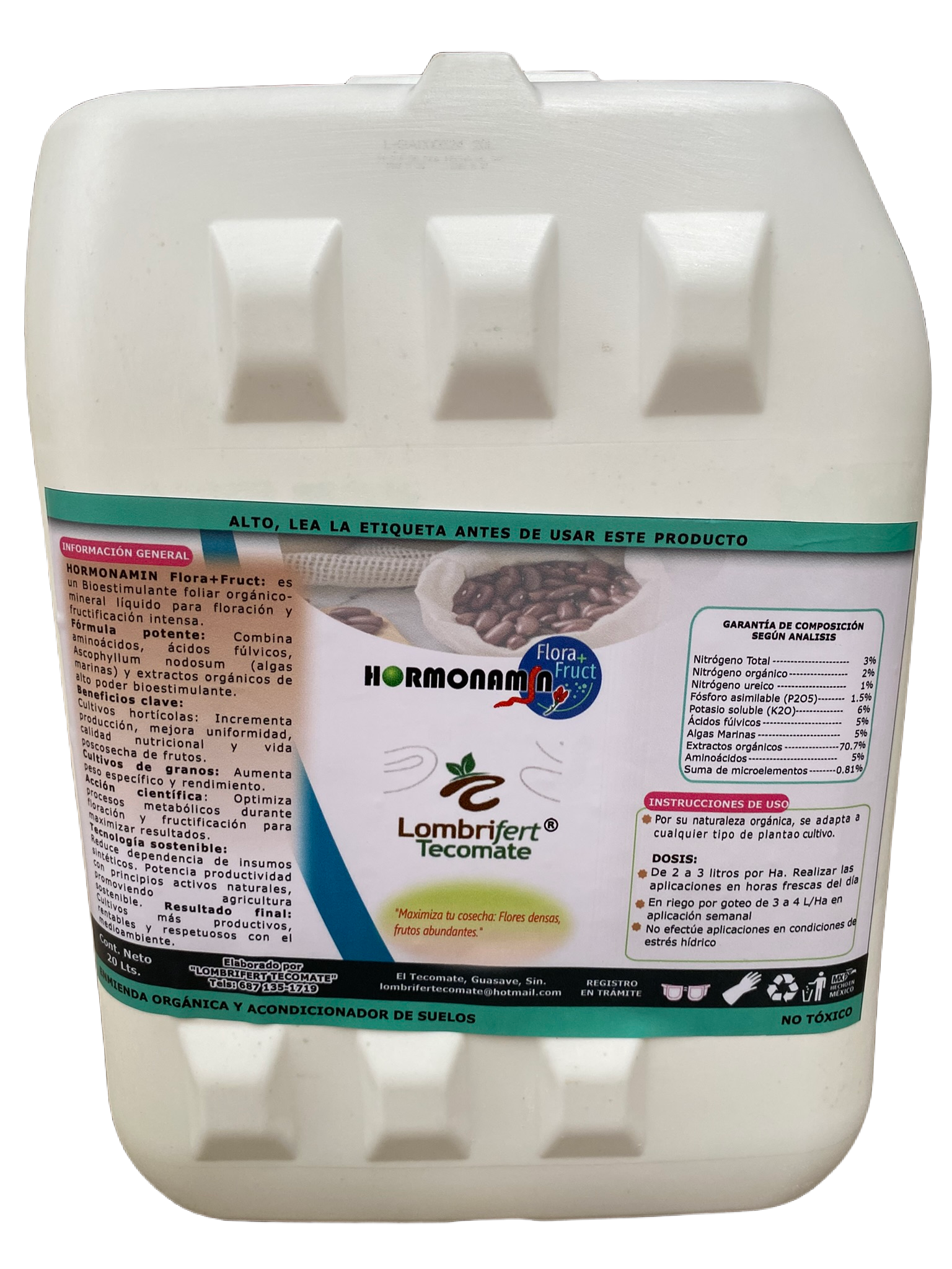 HORMONAMIN Flora+Fruct es un bioestimulante orgánico-mineral certificado por OMRI, diseñado para potenciar la floración y fructificación. Aumenta la producción, mejora la calidad de los frutos y es ideal para agricultura sostenible. ¡Maximiza tu cosecha con ingredientes 100% naturales!