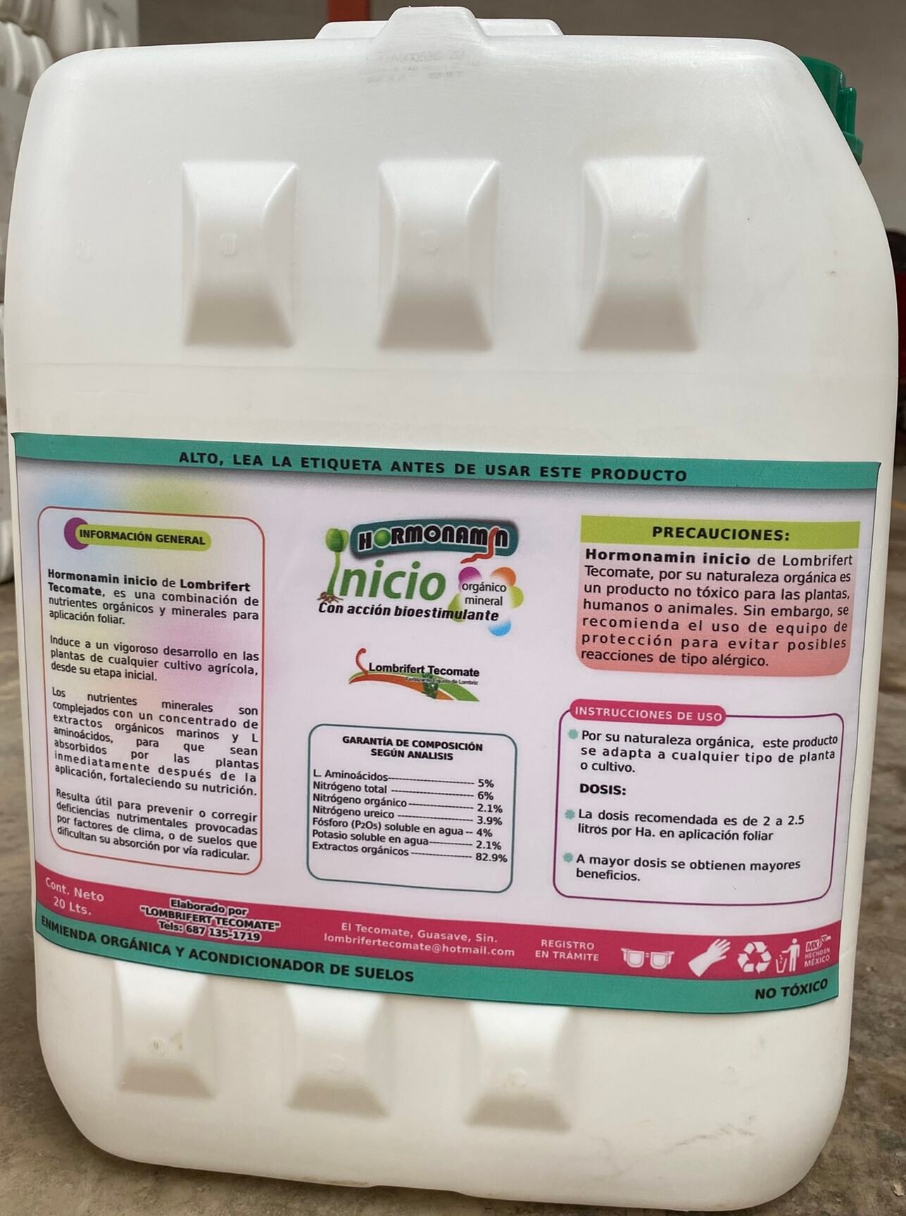 Disponible en presentaciones de 5, 10 y 20 litros. ¡Maximiza tu productividad con HORMONAMIN Inicio y cultiva con respeto por el medio ambiente!